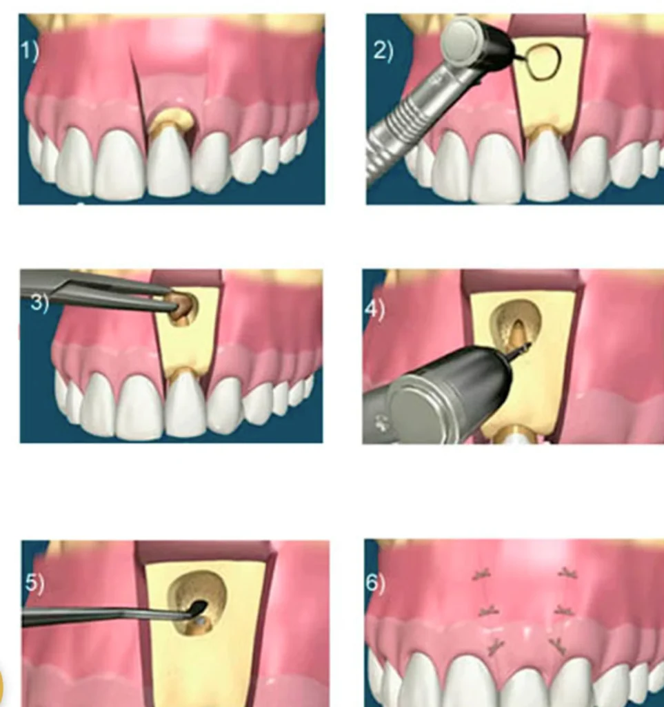 Des points de suture sont posés pour refermer la gencive. Un suivi rigoureux est nécessaire pour surveiller la cicatrisation et détecter d’éventuelles complications.