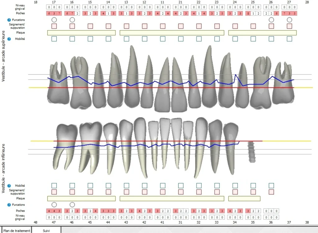 - Examen clinique approfondi avec sondage parodontal (charting) afin d’établir une cartographie des lésions et de matérialiser la position et la santé du ligament parodontal.
