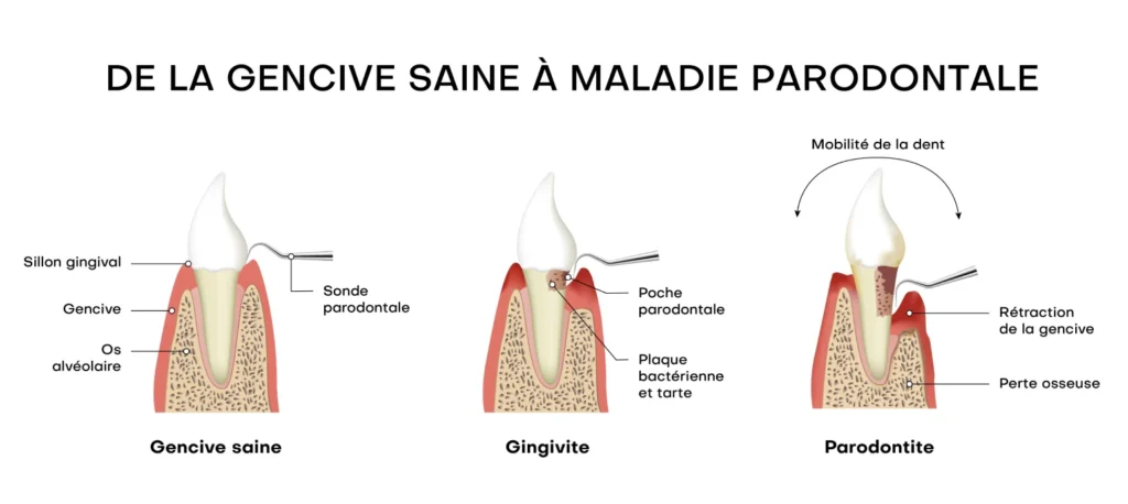 Un examen clinique standard ne suffit pas à diagnostiquer parfaitement la maladie, mais peut permettre de vous orienter vers un bilan parodontal complet en cas de présence de symptômes ou facteurs de risques.